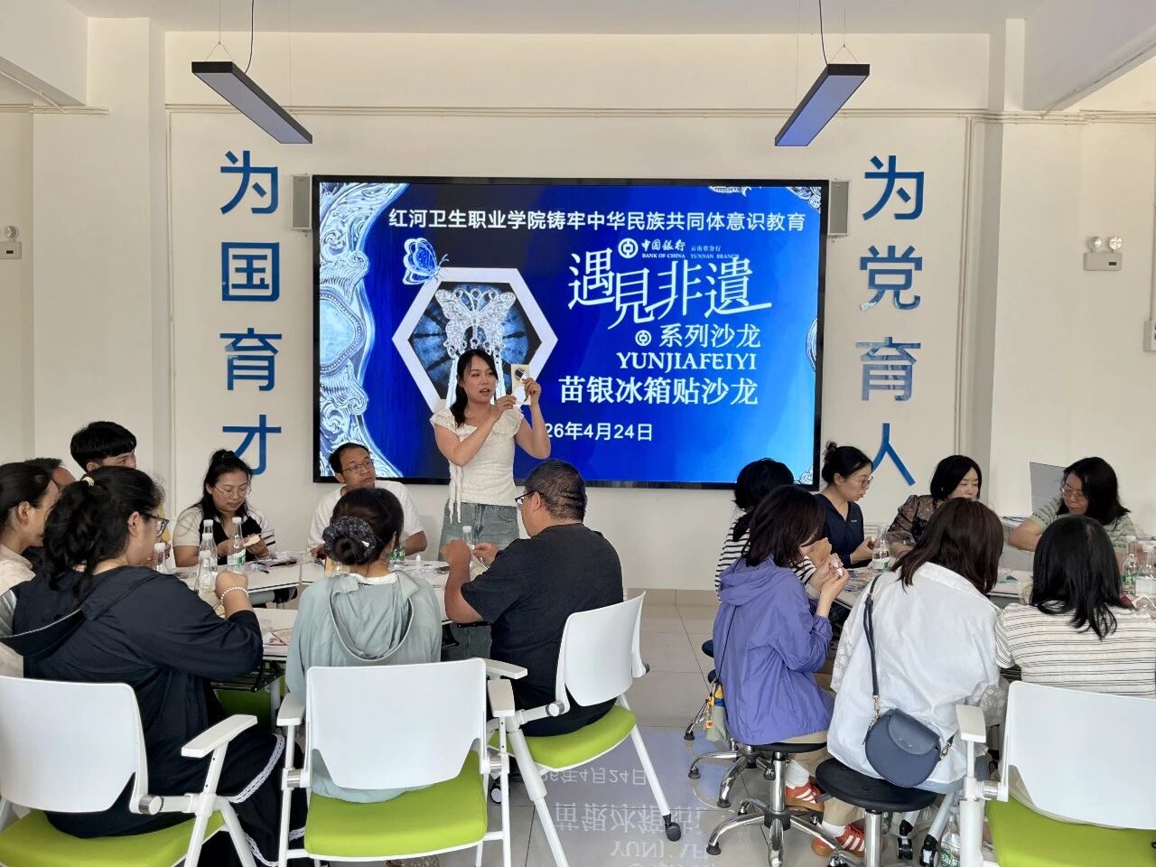 为弘扬中华优秀传统文化,促进各族教职工交往交流交融,2026年4月24日,我校统战部、财务科联合中国银行蒙自市上海路支行开展铸牢中华民族共同体意识教育——“匠心筑梦·致敬劳动者”苗银冰箱贴手作活动,以喜闻...