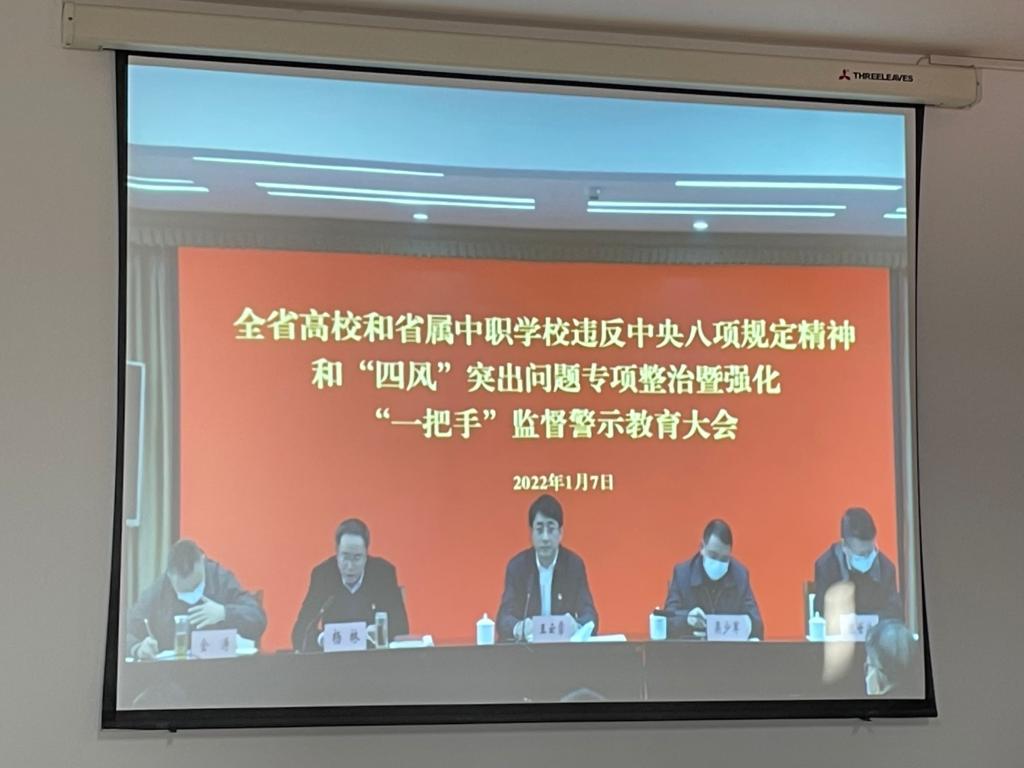 1月7日下午14:30,按省委教育工委工作部署要求召开全省高校和省属中职学校违反中央八项规定精神和“四风”突出问题专项整治暨强化“一把手”监督警示教育大会,会议以视频会形式召开,学院党委领导班子,财务、人事部门主要负责人,纪检科全体人员参加。会议观看了近期警示教育片,并通报了近期查办的违反中央八项规定精神和“四风”突出问题情况。最后省教育厅厅长王云霏同志讲话。