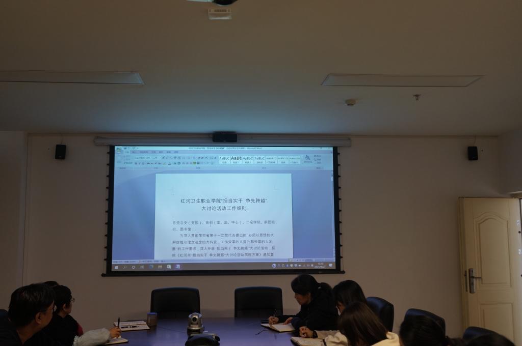 为深入学习贯彻党的十九届六中全会精神和云南省第十一次党代会、红河州第九次党代会精神,财务科于2021年12月31日下午14:30在图书馆四楼会议室开展了“担当实干 争先跨越”大讨论活动学习讨论会,会议由李昊宸科长主持,财务科全体教职工参加会议。