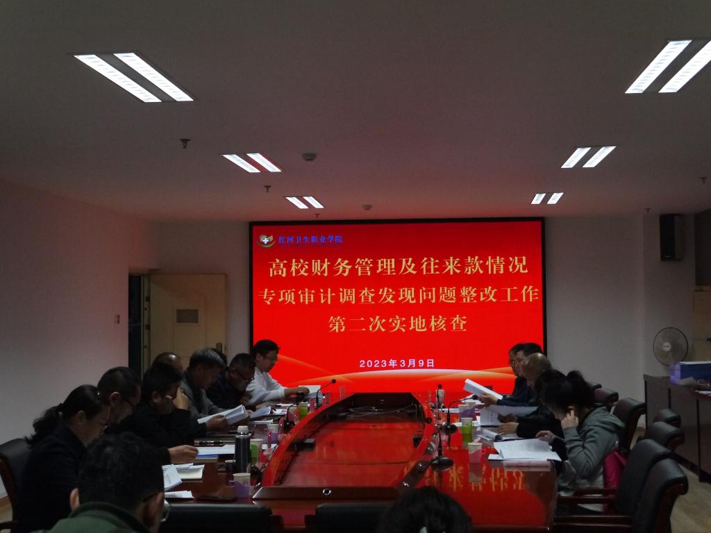 2023年3月9日云南省教育厅第二核查组到我校开展财务管理及往来款情况专项审计调查发现问题整改工作实地核查。会议于晚19:30在图书馆九楼第一会议室进行,学校党委书记张云学,党委副书记、院长唐飚,党委副书记周云雄,党委委员、纪委书记杨坤,党委委员、副院长朱有才,党委委员、副院长李锋及学校财务、审计、纪检、教务等有关部门主要负责人参加检查汇报会,学院党委书记张云学主持会议。