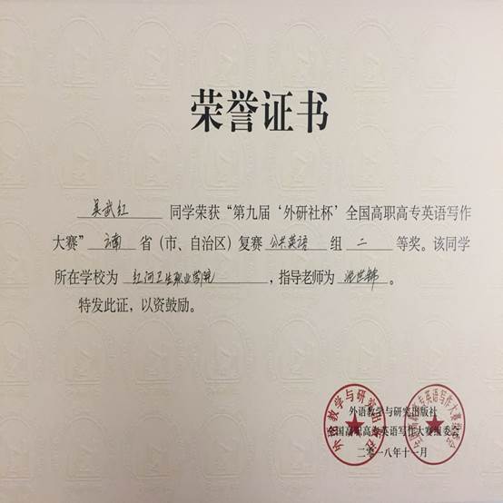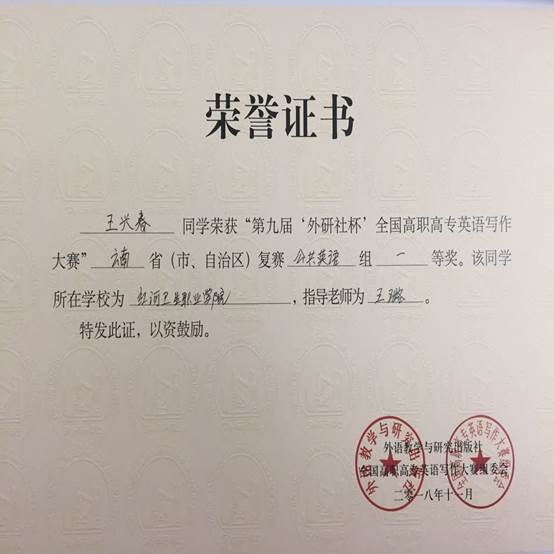 喜讯:第九届“外研社杯”全国高职高专英语写作大赛云南省赛区复赛,我院王兴春和吴武红2名选手经过公共课部英语教研室王璐、沈世锦老师指导后分获一等奖和二等奖。 (图文 沈世锦)