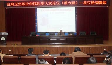 2018年12月8日晚19:30,红河卫生职业学院医学人文论坛(第六期)在图书馆报告厅举行。论坛邀请了新疆诗词学会会长、新疆师范大学文学院教授王浩之(笔名星汉)教授作了主题为“星汉.诗词漫谈”为内容的讲座。本期论坛由公共课部副主任王红亮主持。