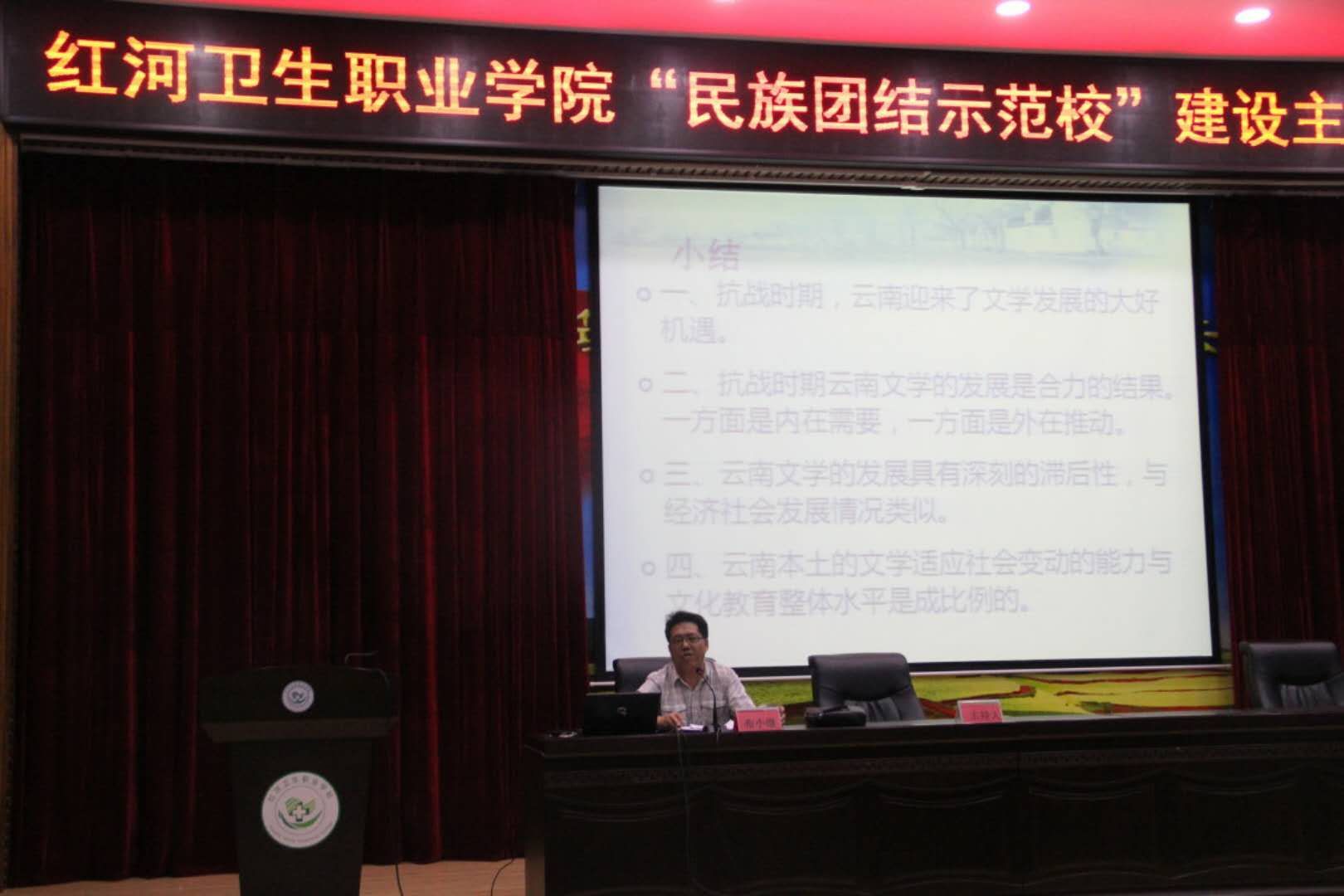 在全州上下努力创建“民族团结示范州”之际,我校为创建“民族团结示范校”营造良好的民族文化氛围,3月21日晚上7:30分在学院图书馆报告厅,开展了题为“抗战时期的云南文学”的主题讲座。主讲嘉宾为红河学院文学院布小继博士、教授。讲座由公共课部副主任王红亮老师主持,全校300余名师生参加了讲座。
