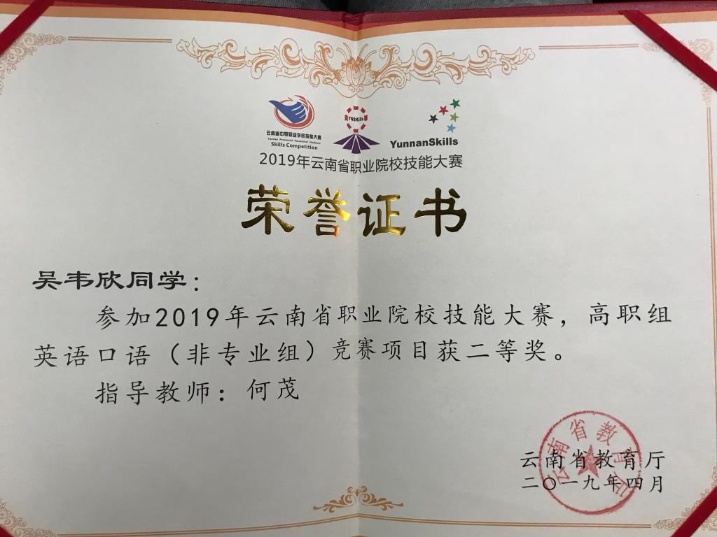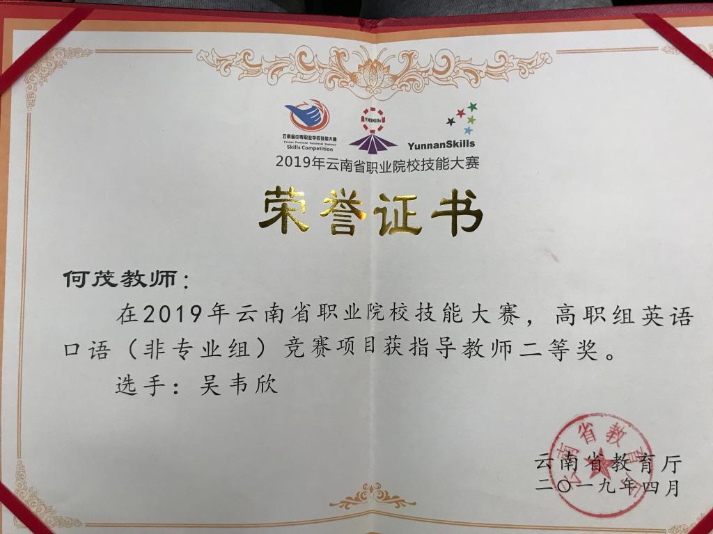 喜报:外语教研室何茂老师指导的吴韦欣同学荣获2019年云南省职业院校技能大赛高职组英语口语(非专业组)二等奖。