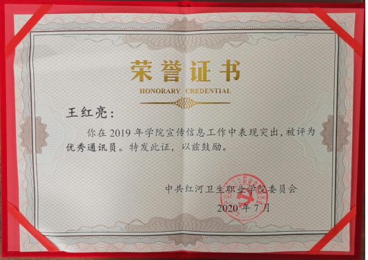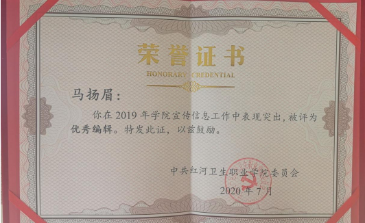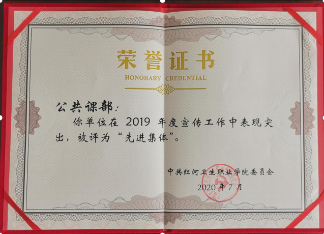 2020年7月15日,在红河卫生职业学院2020年宣传思想工作暨业务培训会上,公共课部喜获学院2019年宣传工作“先进集体”表彰;公共课部教师王红亮、吴昌盛获得优秀通讯员表彰,马扬眉老师获得优秀编辑表彰。