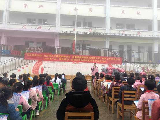 11点,捐赠仪式正式开始。首先进行了升国旗,奏唱国歌仪式。随后,大冲村委会熊开云主任致了欢迎辞,云南城投昕益医药有限公司中药部总监王旭、红河州中正建筑装饰公司董事长彭洪祥、蒙自佳美口腔张义宏院长等分别代表3家企业做了简短发言。