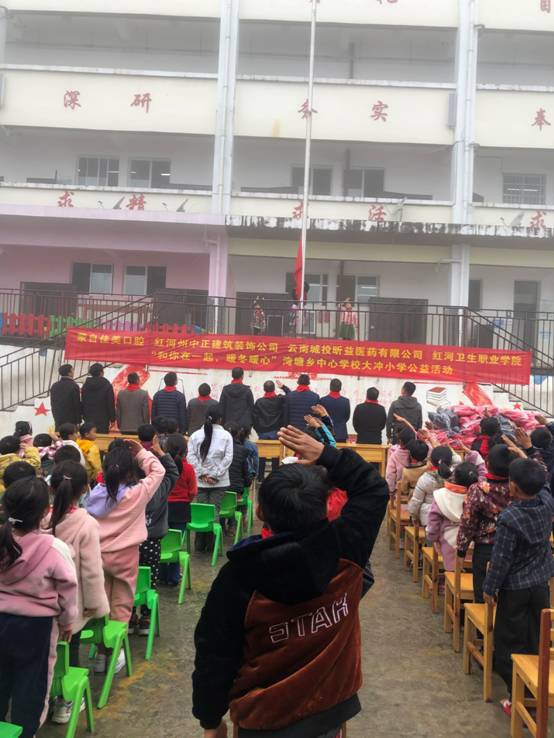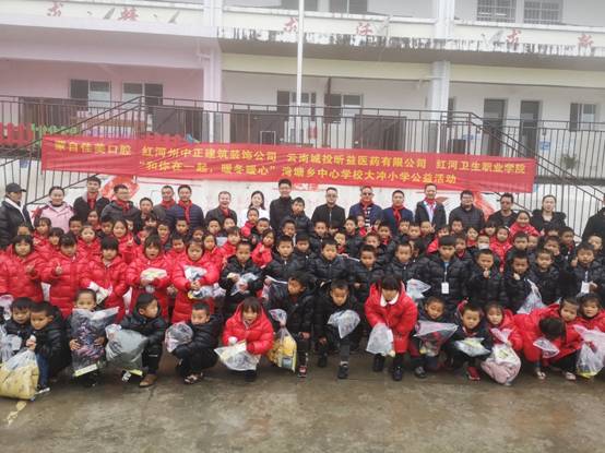 12月16日上午,红河卫生职业学院联合蒙自佳美口腔、红河州中正建筑装饰公司、云南城投昕益医药有限公司等企业到屏边县湾塘乡中心学校大冲小学开展公益活动。红河卫生职业学院党委委员、组织部部长、大冲驻村扶贫工作队第一书记、队长杨兴文、湾塘乡中心学校校长黄兴祥、大冲村委会主任熊开云等参加了捐赠仪式。