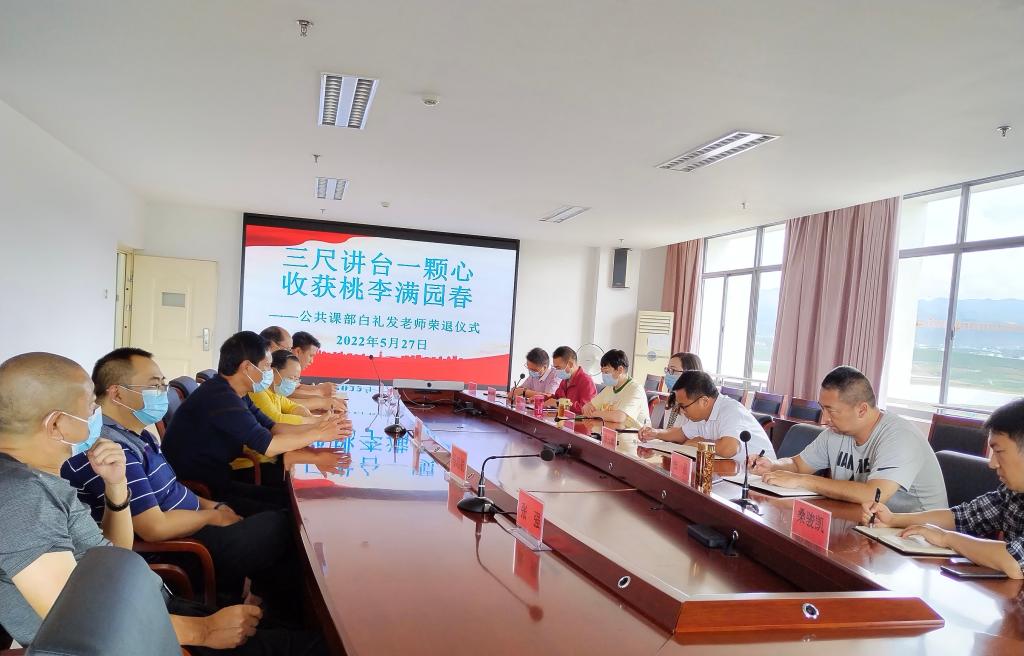 又是一年凤凰花开。5月27日,公共课部在校务管理中心九楼第二会议室举办白礼发老师荣退仪式。学校党委副书记周云雄出席仪式并讲话。学校工会主席刘毅、人事科科长张星、老干部管理工作人员孙艳、张强、公共课部党政领导班子、公共课部数理教研室教师代表等15人参加荣退仪式。