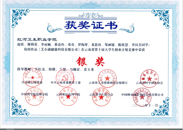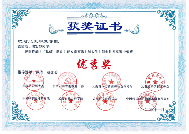 校团委精心组织,经过校赛从39个作品中评选出的10个优秀作品代表学校参加云南省赛,经过省级复赛、省级终审决赛答辩等环节,获得银奖1个、铜奖5个、优秀奖3个。其中公共课部王红亮、苏玉龙老师指导的作品《艾小满健康科技有限公司》、万宇羽老师指导的作品《“颐康”养老之家 》、李玉艳老师指导的作品《掌勺味蕾》、赵健美老师老师指导的作品《 “低碳”膳食 》分别获得银奖、铜奖、优秀奖、优秀奖。