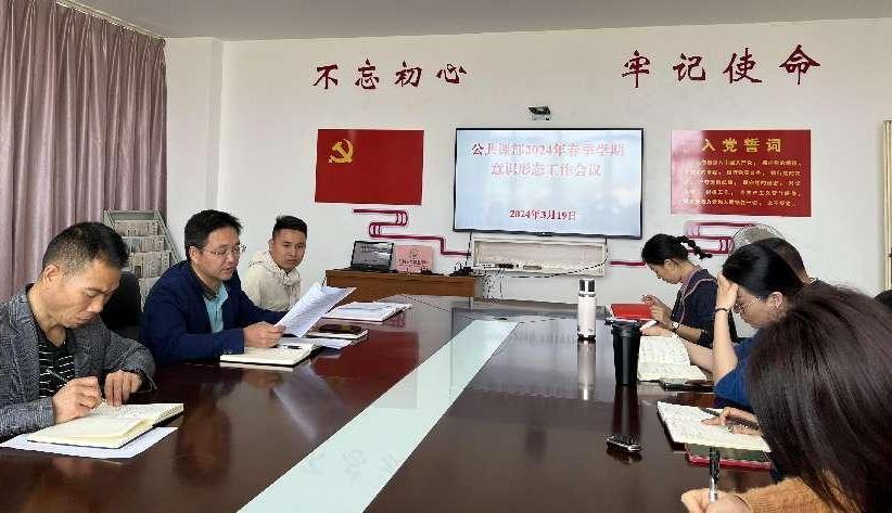 3月19日下午16:20公共课部在图书馆9楼第二会议室召开春季学期工作会议。公共课部主任曹学光、公共课部党总支书记王红亮、教师一、二支部支委和各教研室主任参加了会议。会议由王红亮书记主持。