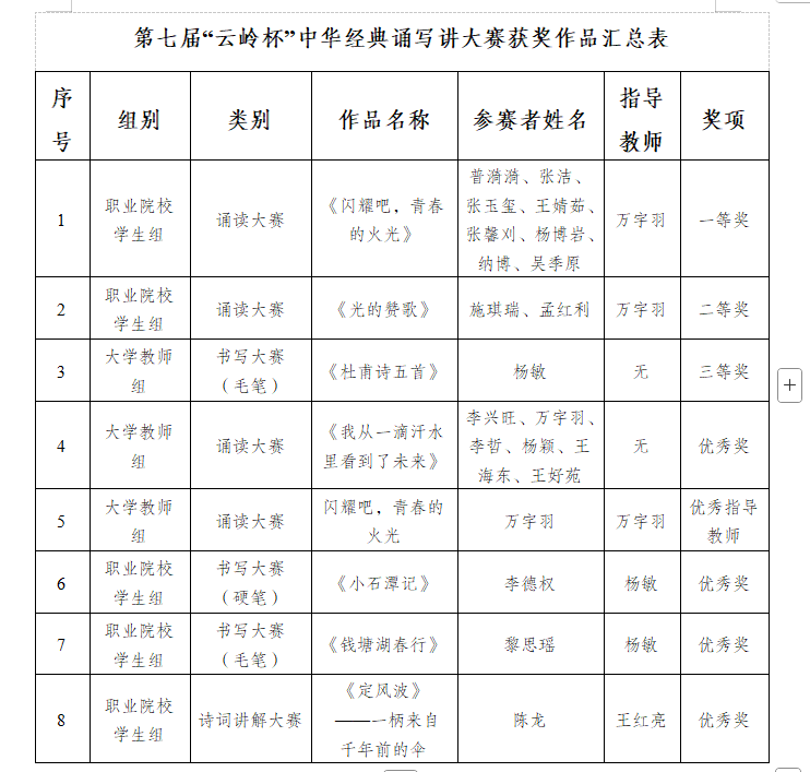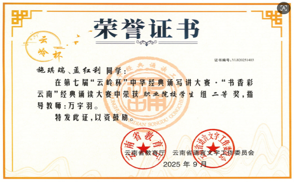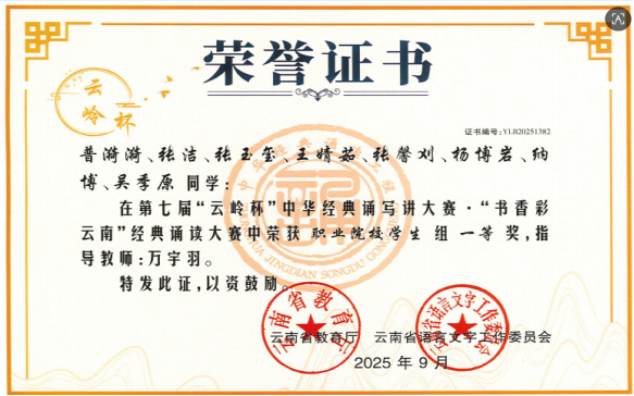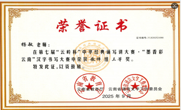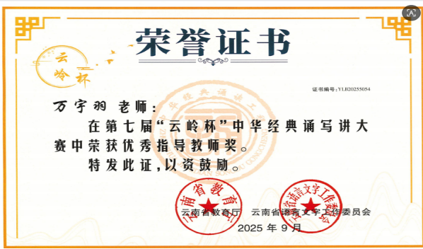 近日,由云南省语言文字工作委员会、云南省教育厅主办的第七届“云岭杯”中华经典诵写讲大赛结果揭晓。我校选派选手表现优异,共荣获一等奖1个,二等奖1个,三等奖1个,优秀奖4个,万宇羽老师获得优秀指导教师称号。