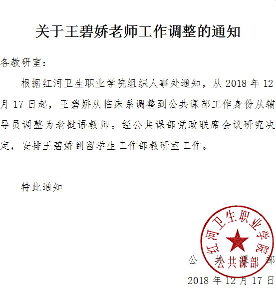 关于王碧娇老师工作调整的通知