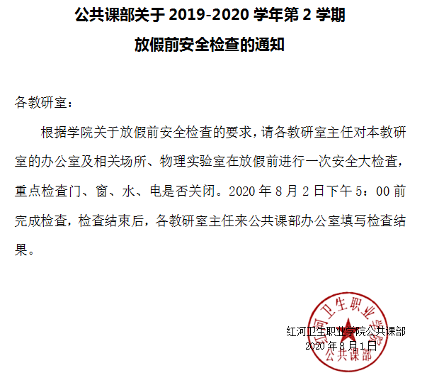 公共课部关于2019-2020学年第2学期放假前安全检查的通知