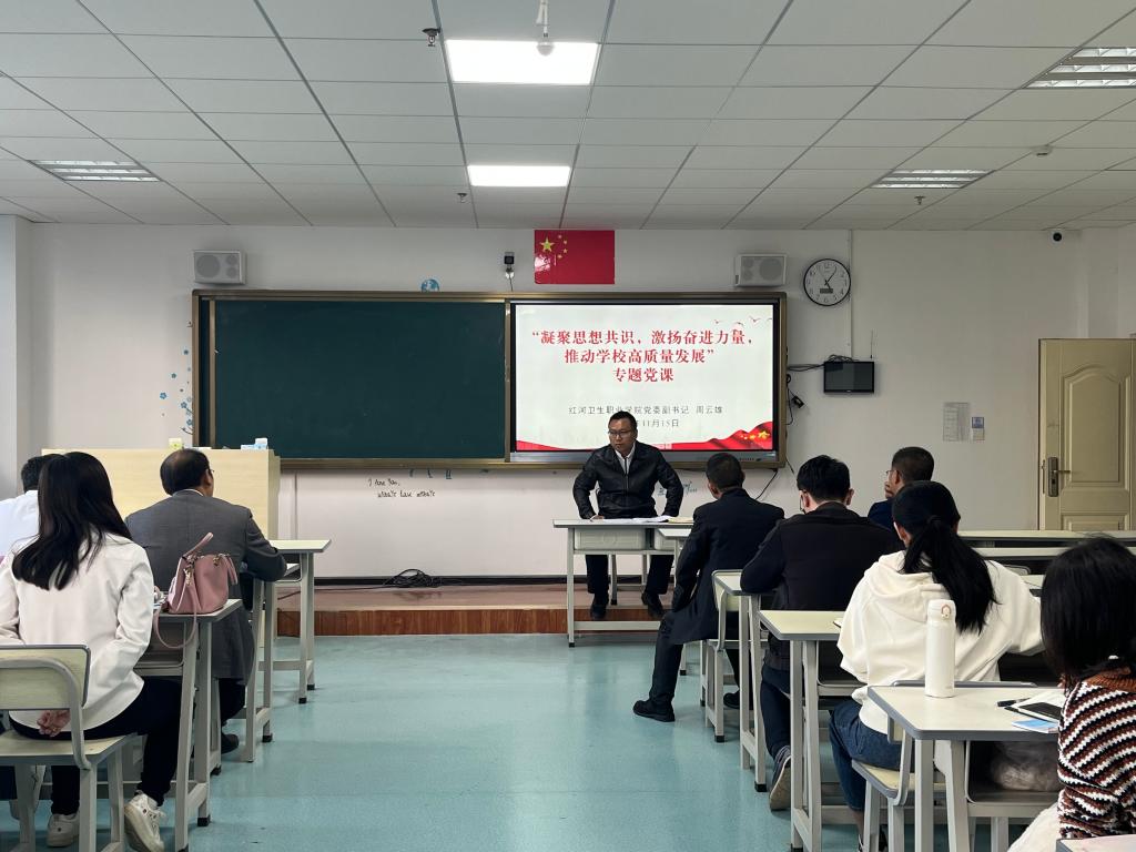 2023年11月15日,学院党委副书记周云雄在公共课部讲授“凝聚思想共识,激扬奋进力量,推动学校高质量发展”专题党课时强调,要统一思想,以学促干,在推动学校高质量发展上展现新作为。公共课部党总支书记王红亮主持,公共课部全体党总支党员参加党课。