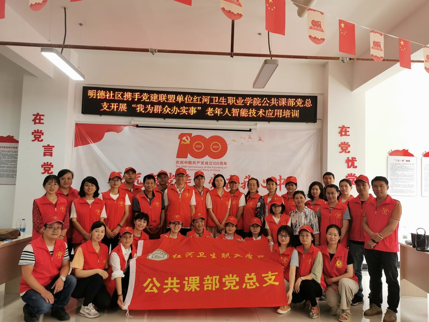 2021年7月14日公共课部党总支到明德社区开展“我为群众办实事”老年人智能技术应用培训活动