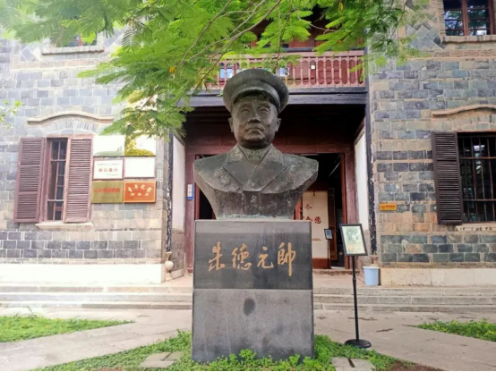 走进朱德旧居陈列室,慕名前来的游人纷纷驻足瞻仰朱德元帅的铜像,铜像基座背面是朱德夫人康克清于1991年为纪念朱德诞辰105周年所撰写的铭文。院墙内壁嵌刻着朱德一生各个时期创作的革命诗词以及同时代革命家缅怀朱德元帅的题词。