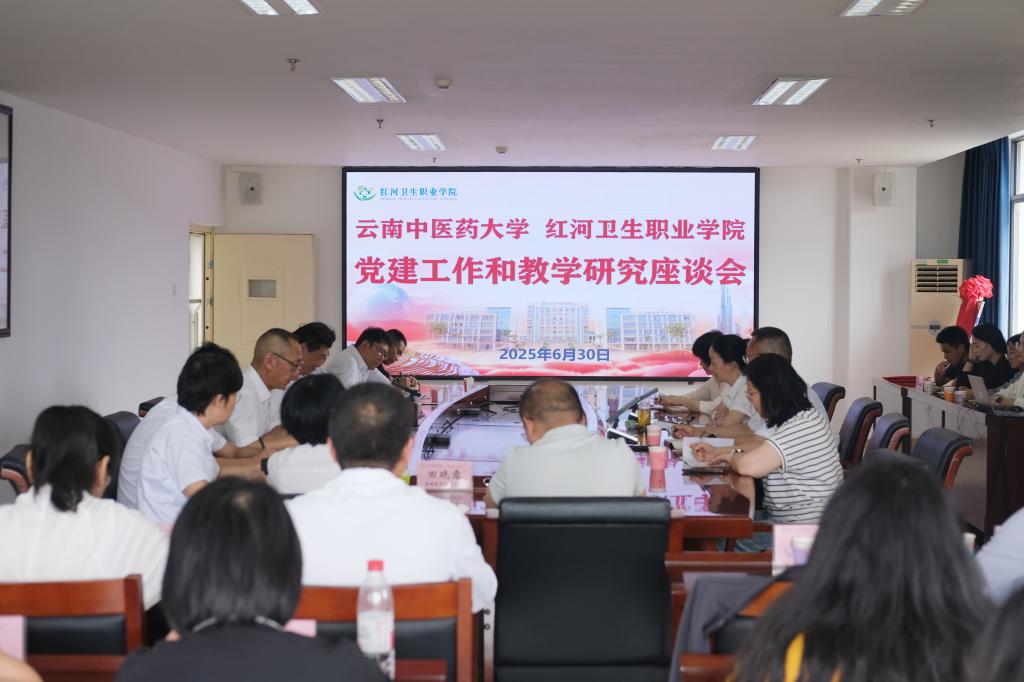 当日下午,党建与教学研究座谈会在厚德楼第一会议室举行,与会人员围绕党建、教学等工作进行深入交流。红河卫生职业学院党委书记王必成简要介绍学校基本情况,并从“强引领、塑品牌、固堡垒、促发展”四个方面介绍了学校党建工作成效;云南中医药大学党委副书记祁苑红从“厚植合作根基、共建共享促发展、借力崭新平台”三个方面分享了党建和教学经验,并提议从“以党建为坚强引领、以质量为立身之本、以服务为核心使命”三方面着手,深化双方合作,共同培养更多扎根边疆、服务人民的高素质医药卫生人才。