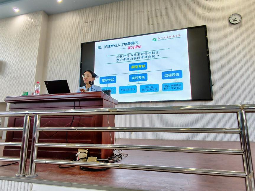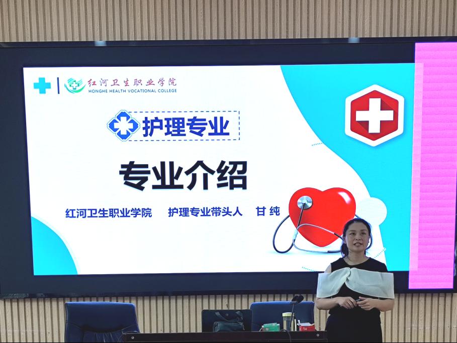 甘纯老师先从课程设置与师资力量两方面介绍专业概况:护理专业核心课程涵盖基础医学、护理学等类别,学院组建了 “资深教师 + 临床专家” 双师型师资团队,为学生提供专业实用的教学指导。