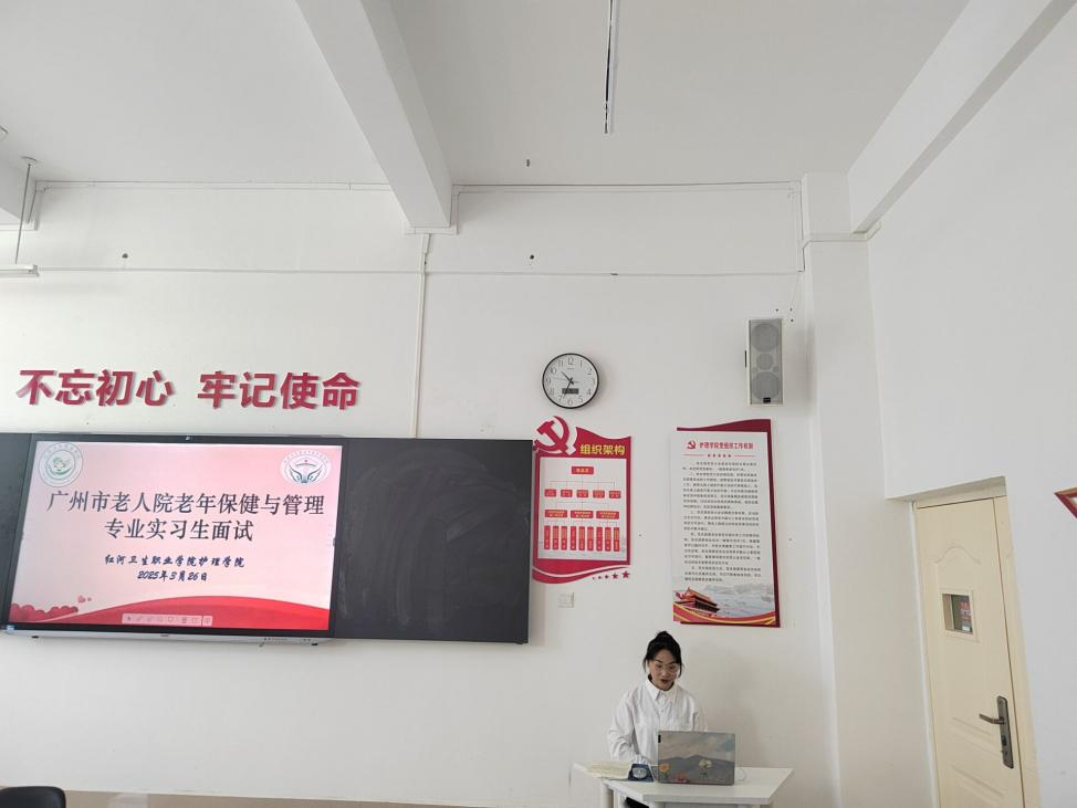 为满足日益增长的养老服务需求,进一步充实专业服务人才队伍,提升养老服务质量,2025年3月26日下午14:30护理学院邀请广州市老人院在红河卫生职业学院至学楼北103教室开展了老年保健与管理专业学生实习前网络面试,通过层层筛选有6名学生进入面试环节。