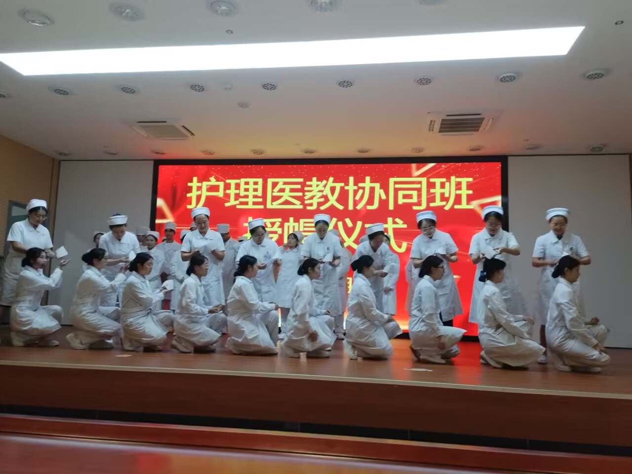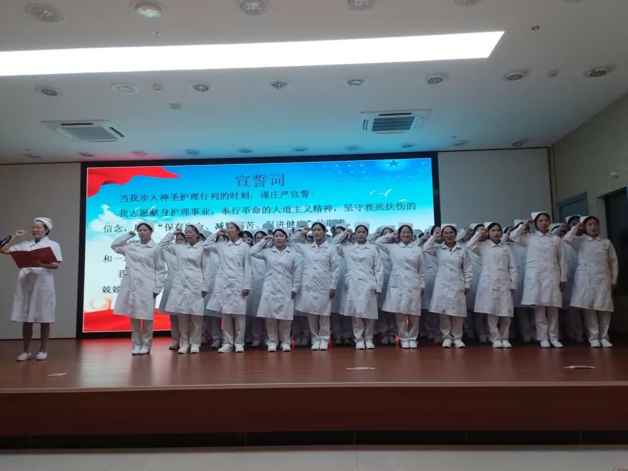 随后,2023级护理2班61名学生参与授帽仪式,在建水县人民医院护理部主任罗兰芬的带领下,庄重宣誓《护士誓词》。希望每一位护理学子珍视这一时刻,传承“燃烧自己,照亮他人”的南丁格尔精神,恪守救死扶伤的人道主义天职,在今后的学习工作中以热忱与耐心对待每一位患者,认真守护生命。