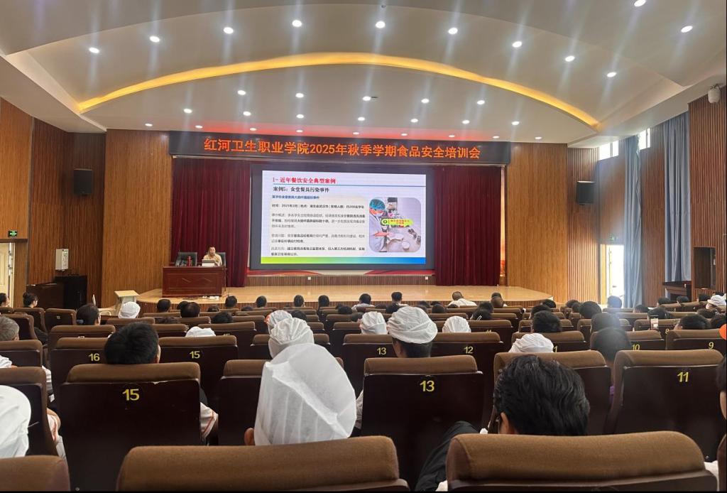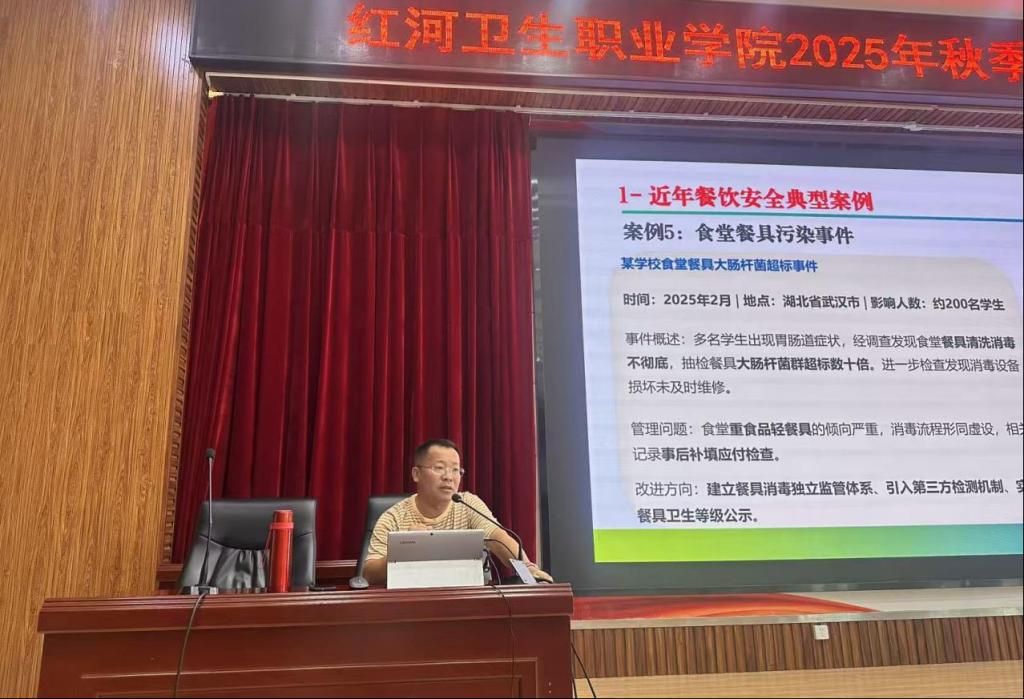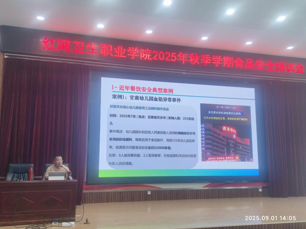 金秋时节,学子归来,舌尖上的安全再度成为校园关注的重点。2025年9月1日14:00,红河卫生职业学院2025年秋季学期食品安全培训会议在厚德楼二楼报告厅召开。后勤管理服务中心陈冬云主任主讲,各食堂企业负责人及从业人员共计200余人参会,此次培训围绕六大要点推进: