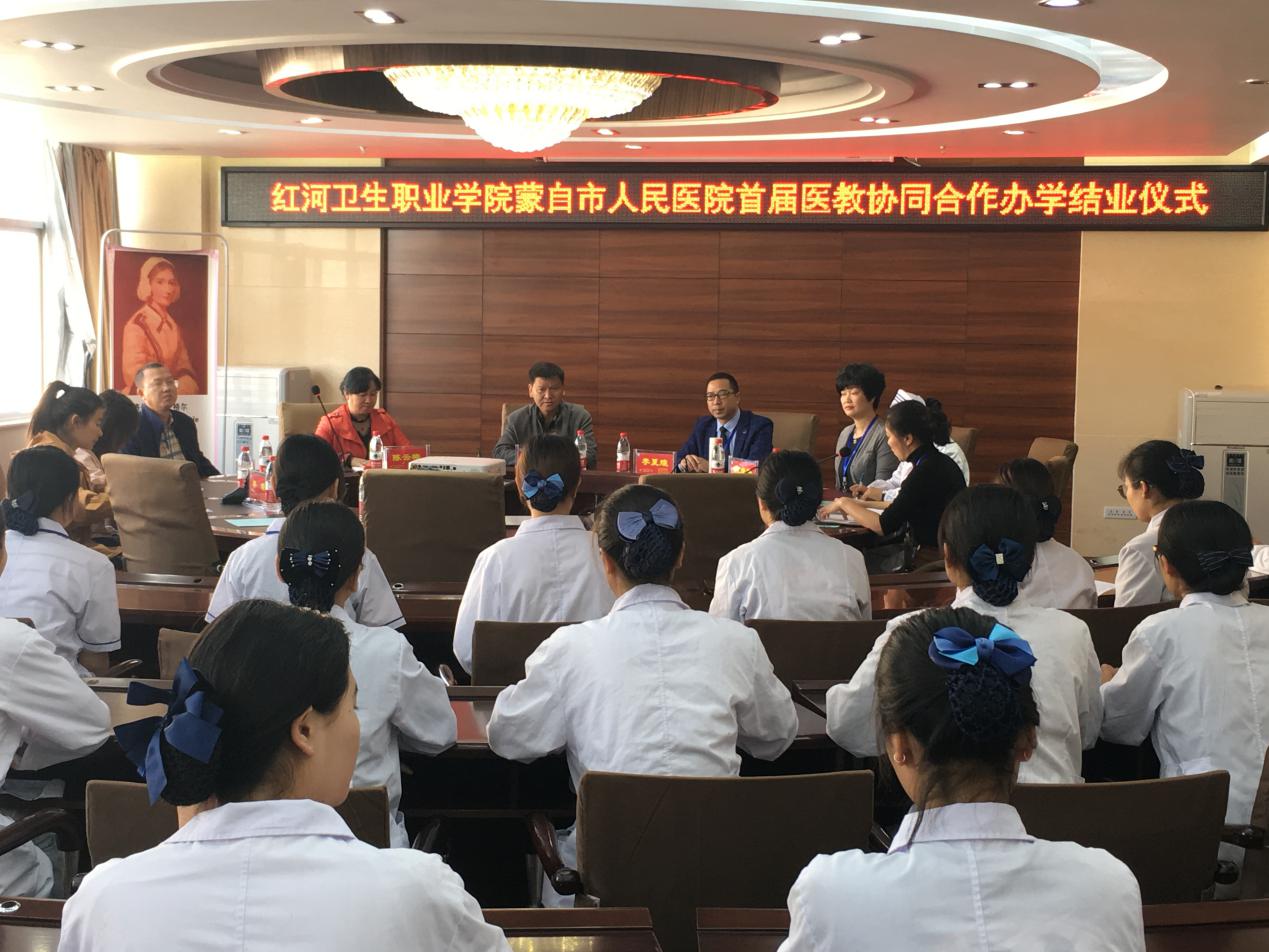 3月21日上午,我校与蒙自市人民医院医教协同合作办学第一届学生毕业典礼暨授帽仪式在蒙自市人民医院门诊八楼大会议室隆重举行。我校党委书记张云学,蒙自市人民医院院长李夏煌等领导出席仪式,仪式由蒙自市人民医院护理部副主任孙静主持。