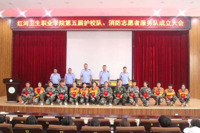 4月17日下午,我校保卫处在图书馆报告厅举行第五届护校队和消防者志愿者服务队成立大会。保卫处老师、护校队全体成员、学生会、团委干部代表参加了大会。