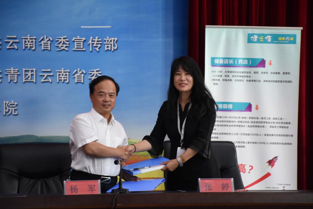 副院长杨军与健之佳人力资源部经理张婷分别代表我校与健之佳公司签约校企合作协议。