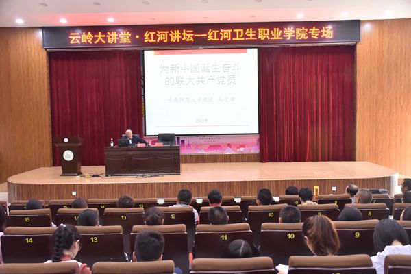 在喜迎中华人民共和国成立70周年华诞之际,为弘扬中华民族优秀文化,推进校园文化建设,我校于9月26日下午,在图书馆报告厅举行云岭大讲堂·红河讲坛——红河卫生职业学院专场。我校有幸邀请了云南师范大学历史学教授、硕士生导师吴宝璋到我校为师生进行主题为“为新中国诞生而奋斗的西南联大共产党员”的专题讲座。党委副书记、院长杨泓,副院长杨军,全体教职工代表、学生代表共300余人参加了此次讲座。讲座由副院长杨军主持。