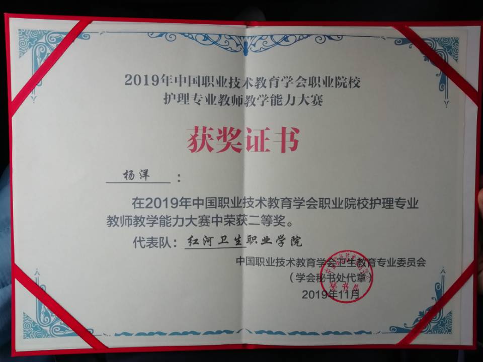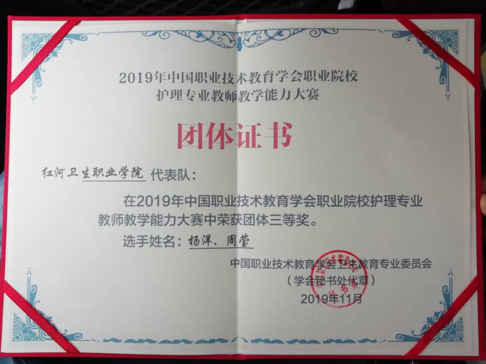 11月28日至12月1日,由中国职业技术教育学会卫生教育专业委员会主办的“第三届职业院校护理专业教师教学能力大赛”在湖南岳阳职业技术学院举行。我校护理系杨洋、周莹老师代表学校参赛并荣获团体三等奖。杨洋老师还荣获个人二等奖。