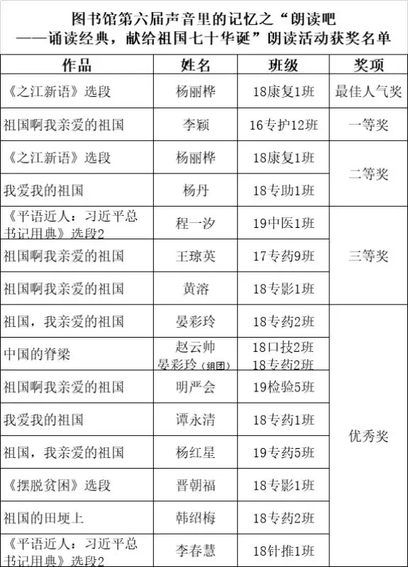 10月23日至12月12日,历时一个多月的第六届声音里的记忆之“朗读吧——诵读经典,献给祖国七十华诞”朗读活动完美落下帷幕。此次活动共有86位学生参与,学生可根据自己的情况自行选择线上(图书馆微信公众平台小程序)、线下(图书馆朗读亭)朗读,朗读后提交作品,分享参与大众投票,本着公平、公正、公开的原则,最终结合多位评委老师的意见及大众投票的票数产生获奖同学14位(含最佳人气奖),获奖名单如下图所示: