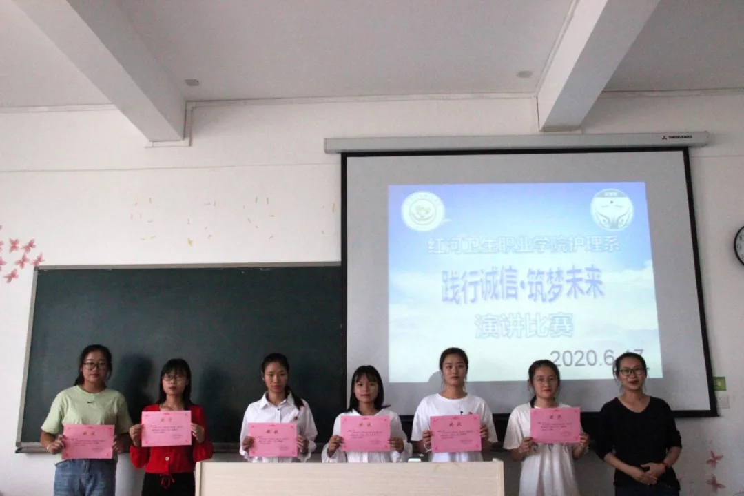 为进一步弘扬诚信做人的光荣传统,营造健康向上的校园文明之风,护理系于2020年6月17日下午在教学楼北401教室开展了“践行诚信,筑梦未来”主题演讲比赛。护理系在校各班级代表23名同学参加比赛。