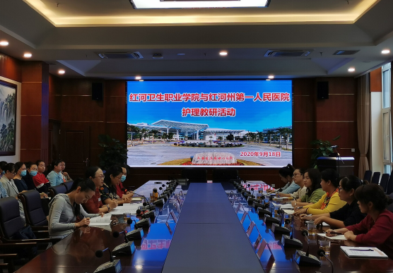 2020年9月18日下午,我校与红河州第一人民医院在医院科教信息综合楼举行了医教协同班的护理教研活动。红河州第一人民医院副院长胡琳,我校党委副书记、院长杨泓,护理系负责人、教研室主任和教师代表参加了活动。
