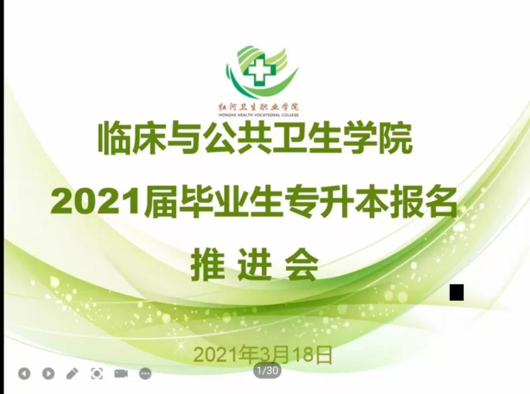 为进一步提升2021届毕业生升学率和就业核心竞争力,临床与公共卫生学院于2021年3月18日晚,通过腾讯会议开展“临床与公共卫生学院2021届毕业生专升本报名工作推进会”。
