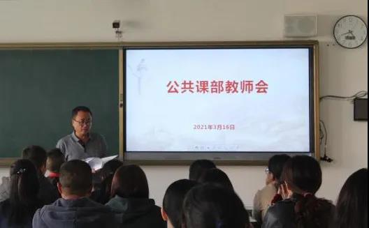 2021年3月16日,公共课部在综合实训楼202教室召开全体教师会议,会议由曹学光主任主持,公共课部除有公务及上课的教师外全都参加了会议。曹学光主任首先向全体教师认真传达学习了3月10日召开的学校年度工作会议相关内容,并就落实会议精神提出了要求。
