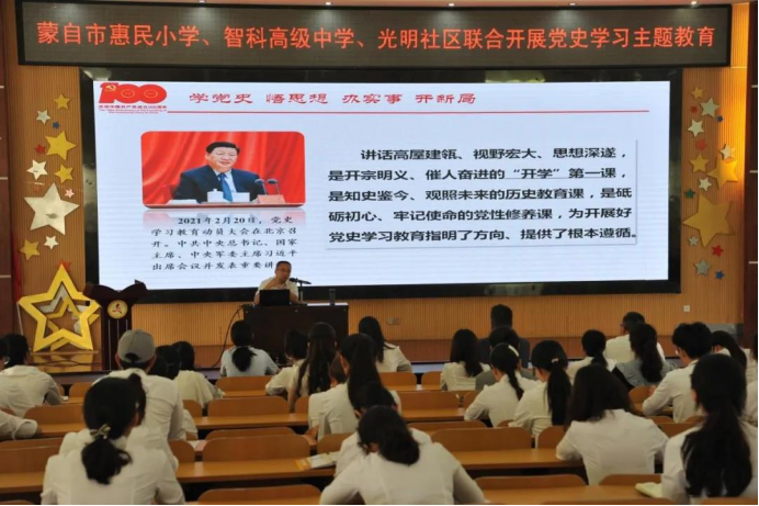 2021年6月25日下午,蒙自市惠民小学与智科高级中学、光明社区联合开展主题为《知史鉴今,赓续精神,在党史学习中汲取复兴力量》学习教育。担任主讲的是红河青年讲师团成员、中共红河州委教育工委宣讲团成员、我校马克思主义学院副院长李兴旺。