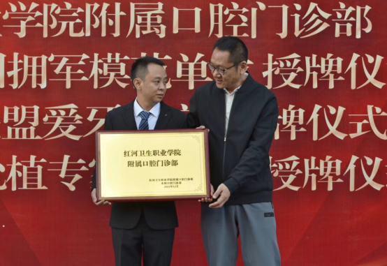 仪式最后,唐飚院长(右)与蒙自市卫健局副局长蒋剑飞(左)共同为红河卫生职业学院附属口腔门诊部揭牌。