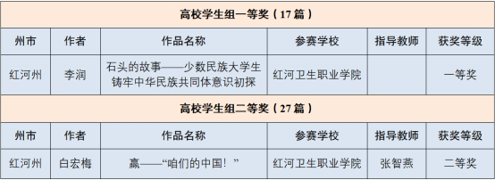 在云南省教育厅、云南省民族宗教事务委员会举办的2023年度学校铸牢中华民族共同体意识教育征文活动中,学院党委高度重视,由统战部牵头组织广大师生积极参与,共收到稿件124篇,经统战部和校团委共同组织评选,报送41篇优秀稿件参加评选,2022级临床医学1班李润同学、2022级专护8班白宏梅同学的作品分别荣获一等奖和二等奖。具体名单如下: