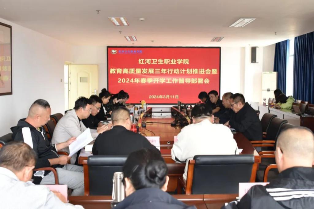 2024年3月11日下午,红河卫生职业学院教育高质量发展三年行动计划推进会暨2024年春季开学工作督导部署会在校务管理中心第一会议室召开。党委书记王必成,党委副书记、院长唐飚,学校高质量发展三年行动计划工作专班成员和相关部门领导参加会议。