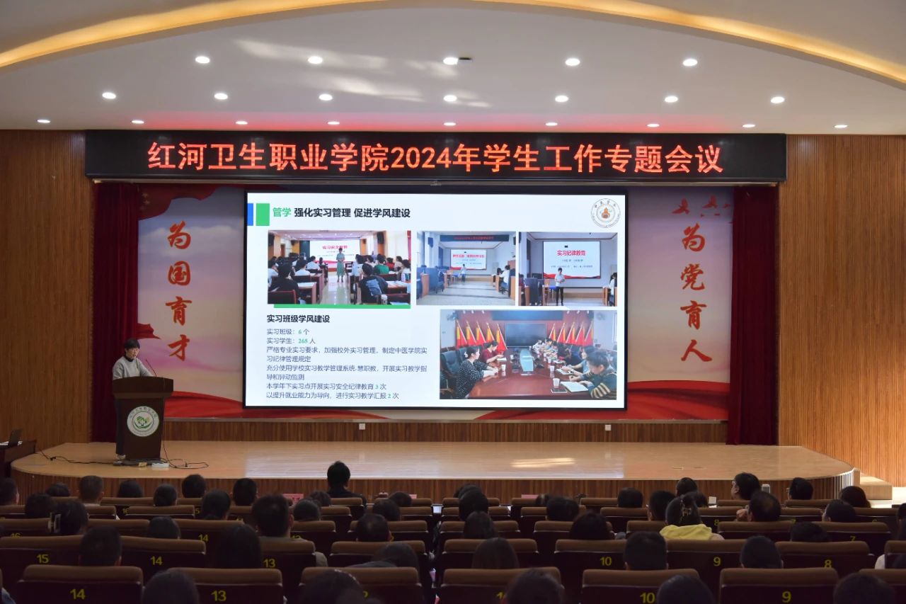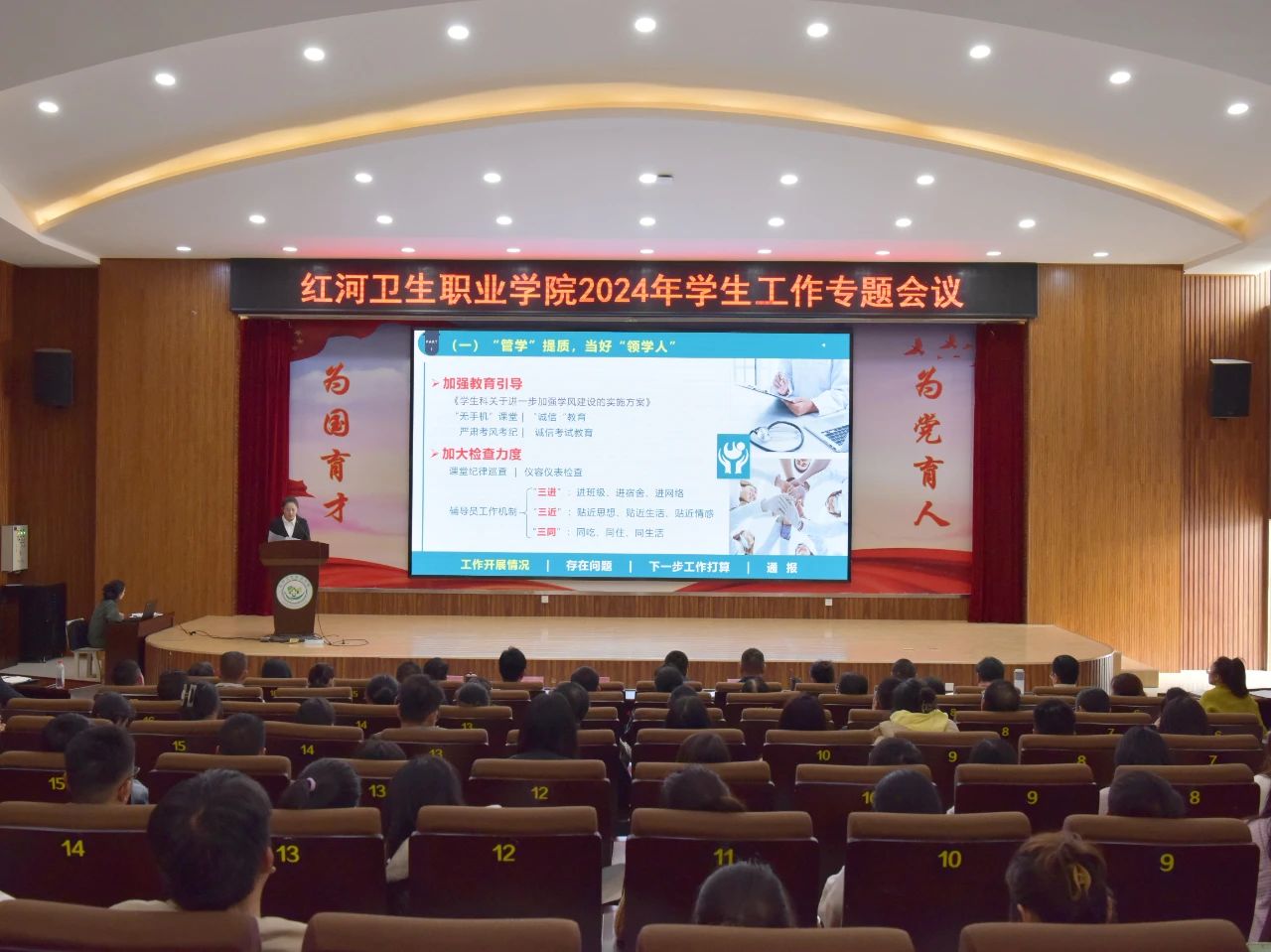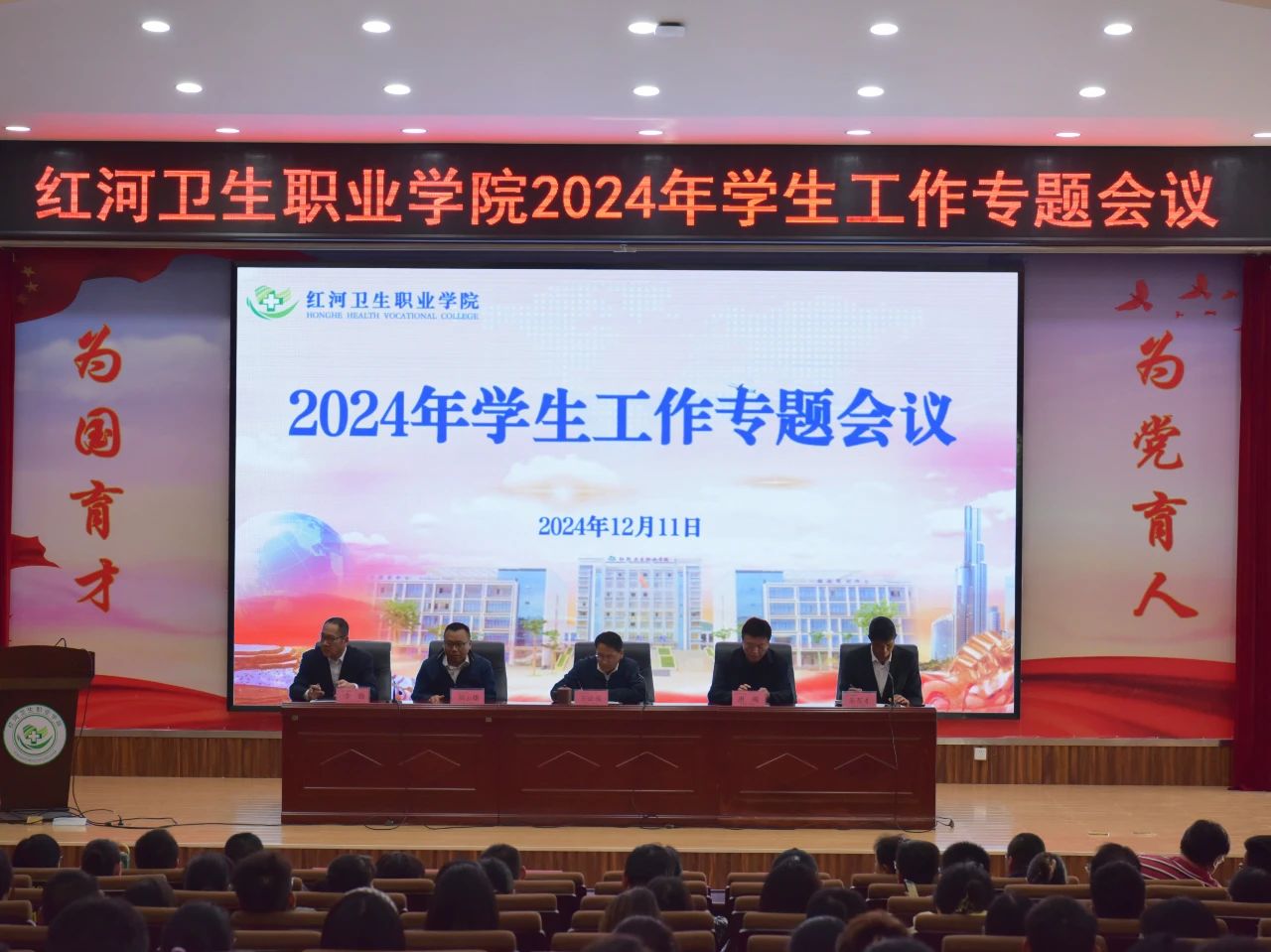 为深入贯彻落实全国、全省教育大会精神,促进全校上下提高认识、提振精神、凝聚共识,助推学生管理服务工作再上新台阶,2024年12月11日下午,红河卫生职业学院组织召开2024年学生工作专题会议,学校领导班子、各科(室、部、中心)、二级学院、群团组织,图书馆负责人、全体辅导员和班主任参会。会议由党委委员、副院长朱有才主持。