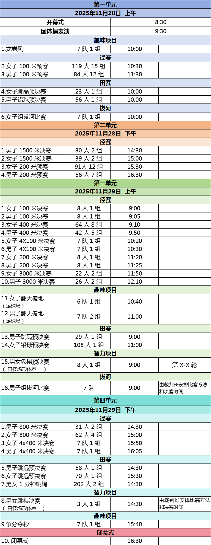 运动会时间 2025年11月28日—29日,于学校田径场举行。