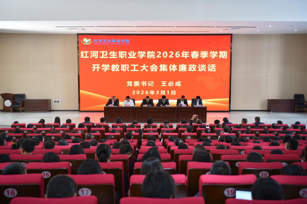 2026年3月1日下午,红河卫生职业学院在博学报告厅召开2026年春季学期开学教职工大会,全面贯彻全省教育工作会议精神,总结发展成效,分析当前形势,部署新学期重点工作,动员全校教职工凝心聚力、实干担当,开启学校高质量发展新征程。党委书记王必成讲话,党委副书记、院长唐飚主持会议。学校党政领导及全体教职员工参加会议。