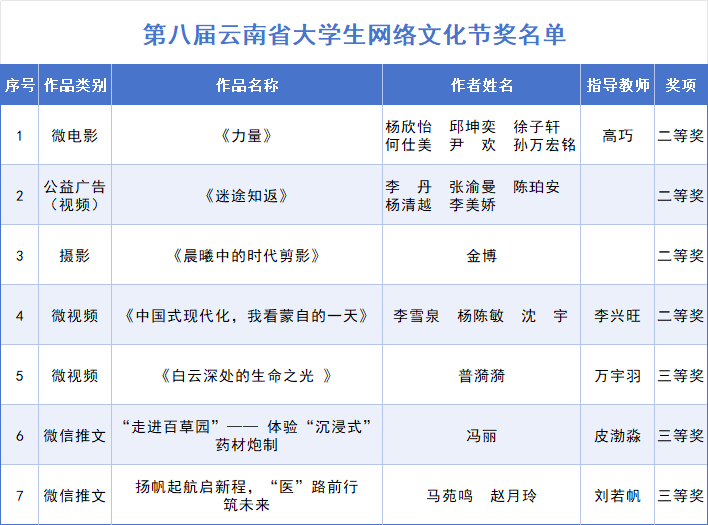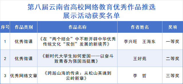 近日,省委教育工委、省委网信办公布了第八届云南省大学生网络文化节和云南省高校网络教育优秀作品推选展示活动获奖名单。红河卫生职业学院共10件作品荣获佳绩。具体获奖情况如下: