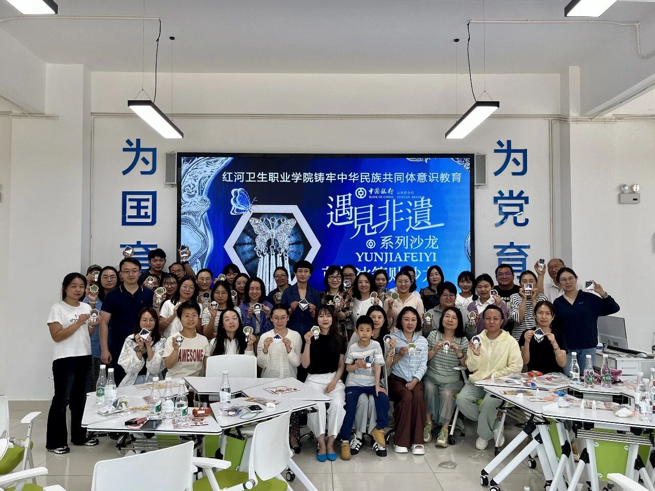 为弘扬中华优秀传统文化,促进各族教职工交往交流交融,2026年4月24日,我校统战部、财务科联合中国银行蒙自市上海路支行开展铸牢中华民族共同体意识教育——“匠心筑梦·致敬劳动者”苗银冰箱贴手作活动,以喜闻乐见的方式铸牢教职工中华民族共同体意识。学校党委委员、副院长李文锦及60余名教职工参加活动。
