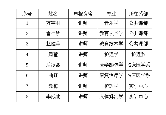 2020年红河卫生职业学院中级职称评审会将于10月份召开,经对申报人员的范围对象、程序手续、基本条件进行了资格审核,现将拟同意提交评委会评审的8名申报人员基本信息予以公示,公示期为10月15日—10月21日。如公示人员不符合资格条件或存在弄虚作假的情况,可向学院监察审计处或人事处书面反映。