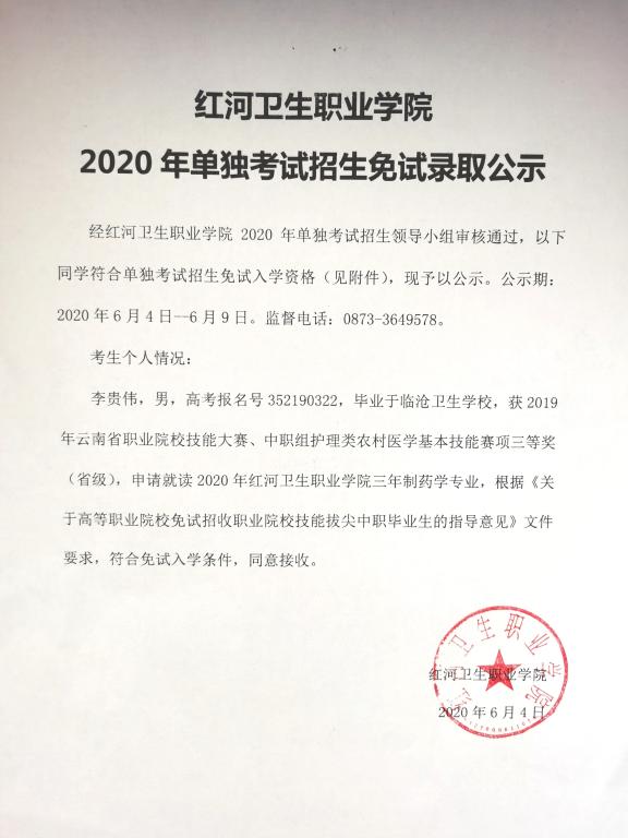 红河卫生职业学院2020年单独考试招生免试录取公示