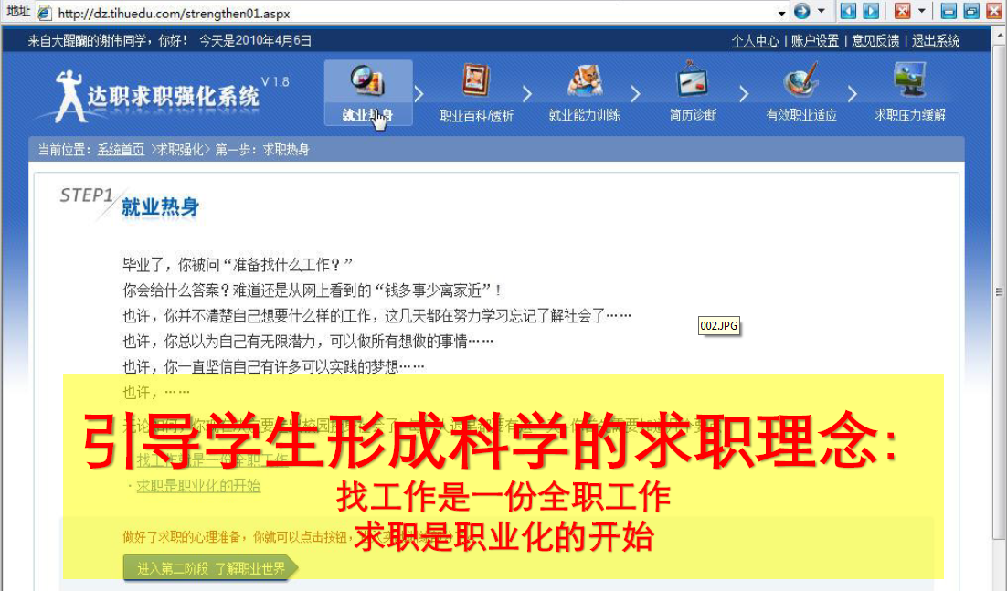 2、六大板块训练:就业热身、职业百科/透析、就业能力训练、简历诊断、有效职业适应、求职能力缓解