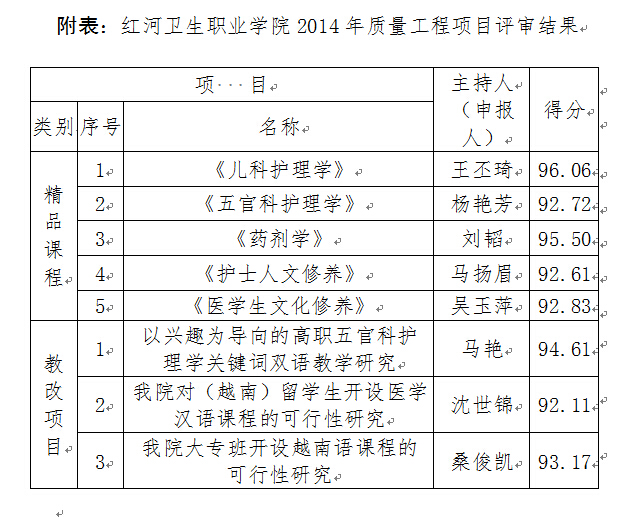 为加强学院内涵建设,提高教育教学质量,提升教师的素质和教学能力,促使学院办学实力不断增强,我院于2014年7月1日组织了本年度教学质量与教学改革工程项目评审会,学院教学质量与教学改革工程办公室按相关文件要求组建评审委员会,根据各项目建设、评审要求,对各项目的申报材料、主持人的申报汇报进行了评审,现将拟同意立项的项目(见附表)进行公示。