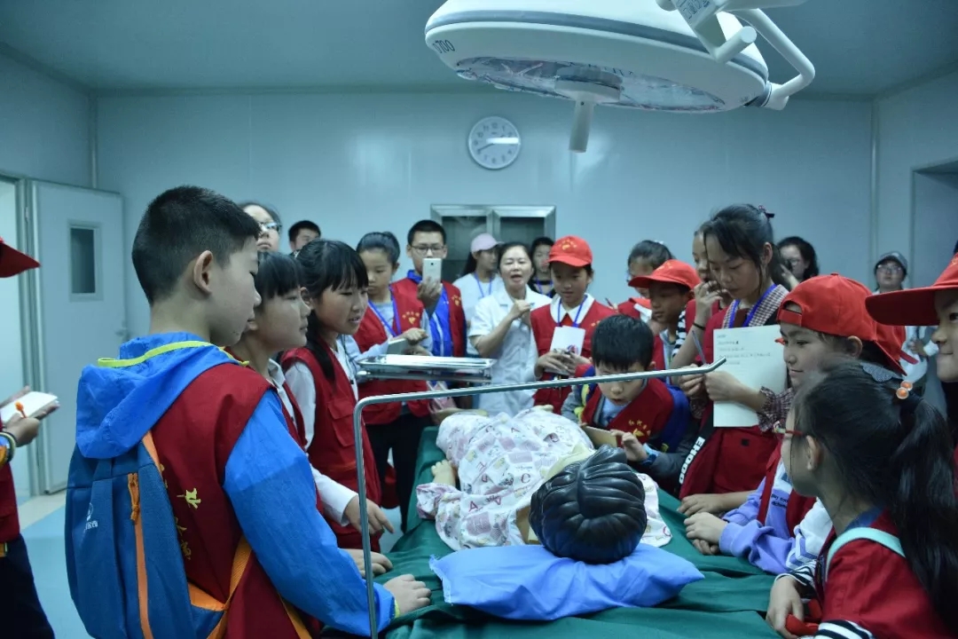 小记者们一行来到手术室,都感到很惊讶,这是真的吗?终于见到了电视里的手术室。在我校张晓红老师的讲解下,他们知道了做手术前的一些准备工作。看到手术台,他们全都一拥而上,把手术台围了个水泄不通。在张老师的讲解和示范下,小记者们一个劲的点头和惊呼,仿佛打开了新世界的大门。另外张老师还介绍了手术室里的一些仪器,如:抢救车、治疗车、麻醉机、无影灯等等。其中还发生了一个小插曲,老师说这个无影灯很贵,要十二万呢,结果小记者们都听错了,听成了十二块,可爱的他们让现场笑语连连,欢乐的时光总是过得很快。