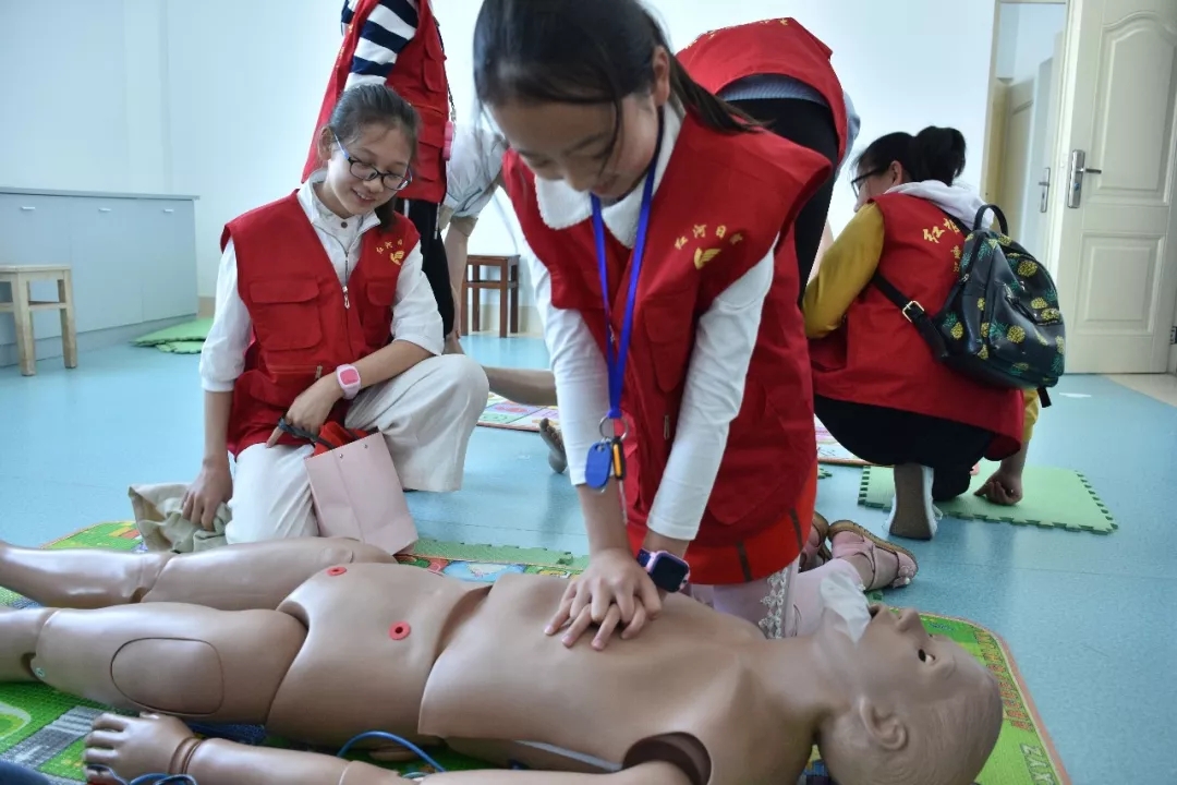 参观完手术室后,在张老师的带领下,小记者们来到急救实训室进行了心肺复苏、创伤救助等方面的学习。他们一行先来到了院外急救实训室,在张老师的生动讲解下,小记者们都很激动,纷纷举手,想要去尝试着怎么做心肺复苏。在张老师示范后,小记者们分成了五个小组,都争着去给实训室里的“假人”做心肺复苏,他们先把小手叠起来,然后放在了那个“假人”的胸前,嘴里还数着01、02、03、04……30。随后他们来到了院内急救实训室,老师给小记者们讲解和示范了创伤救助,小记者先给“假人”做包扎,然后两人一个小组,拿着纱布绷带给对方做包扎。此次创伤救助的课程,在小记者们的心里种下了面对危险时科学应对的种子。希望小记者们回学校后能把学到的急救知识教给身边的同学们。